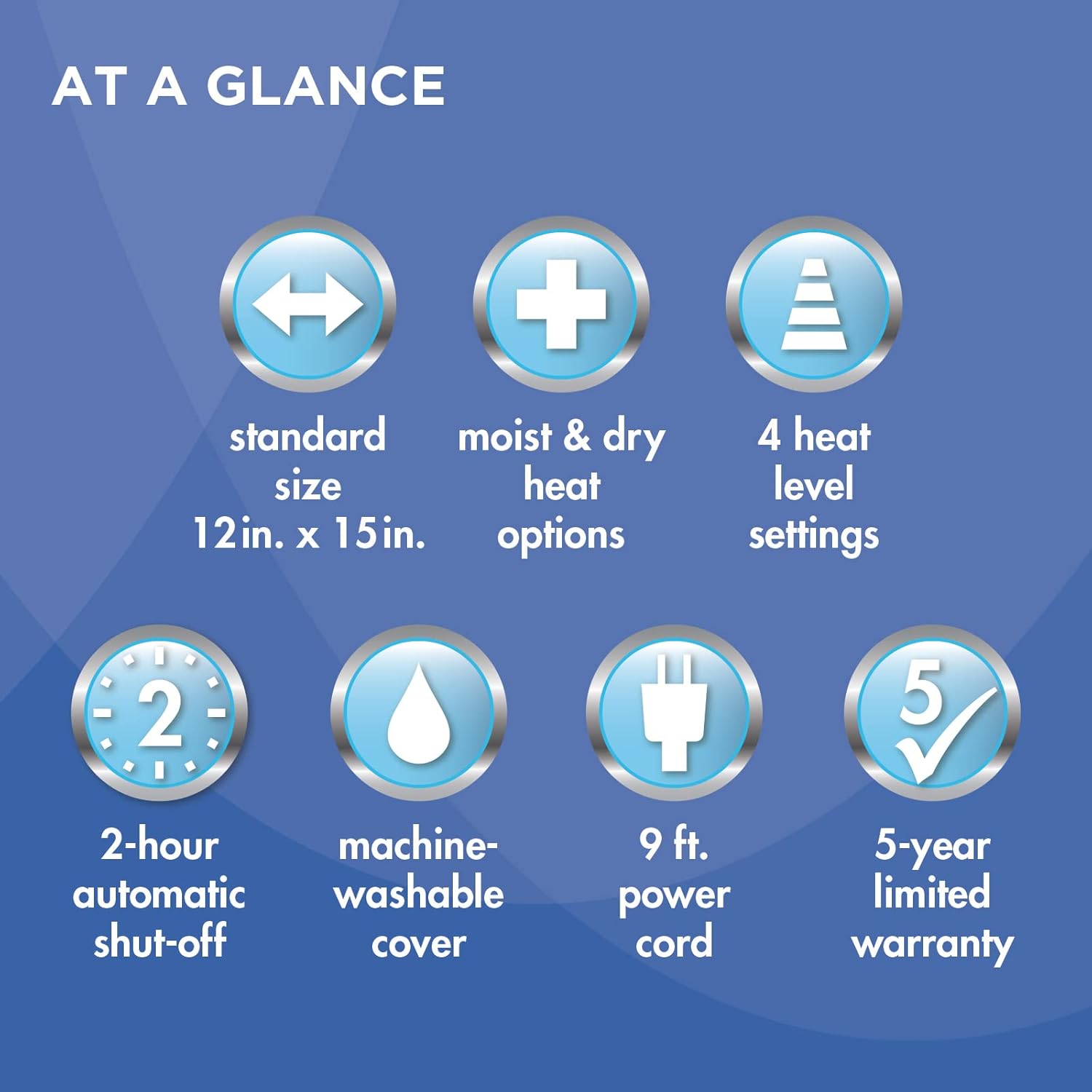 COMPLETE THERAPY SOLUTION — All the features you need in a traditional heating pad: 4-heat settings, 2-hour automatic shut-off, removable machine washable cover, easy to use controller and 5-year limited warranty.