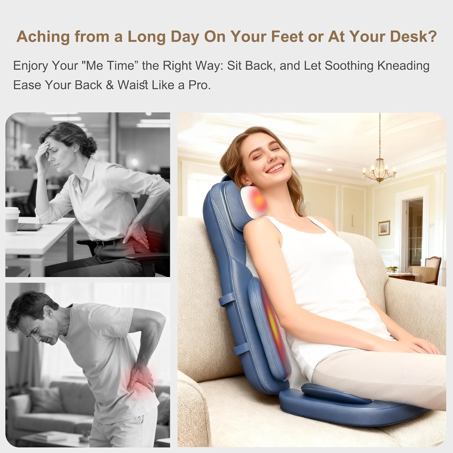 Struggling with lower back tension from hours of sitting? Experience our 3D rolling technology that focuses on your lumbar area with adjustable intensity – from gentle waves to deep kneading, so you can unwind after a busy day and feel rejuvenated.