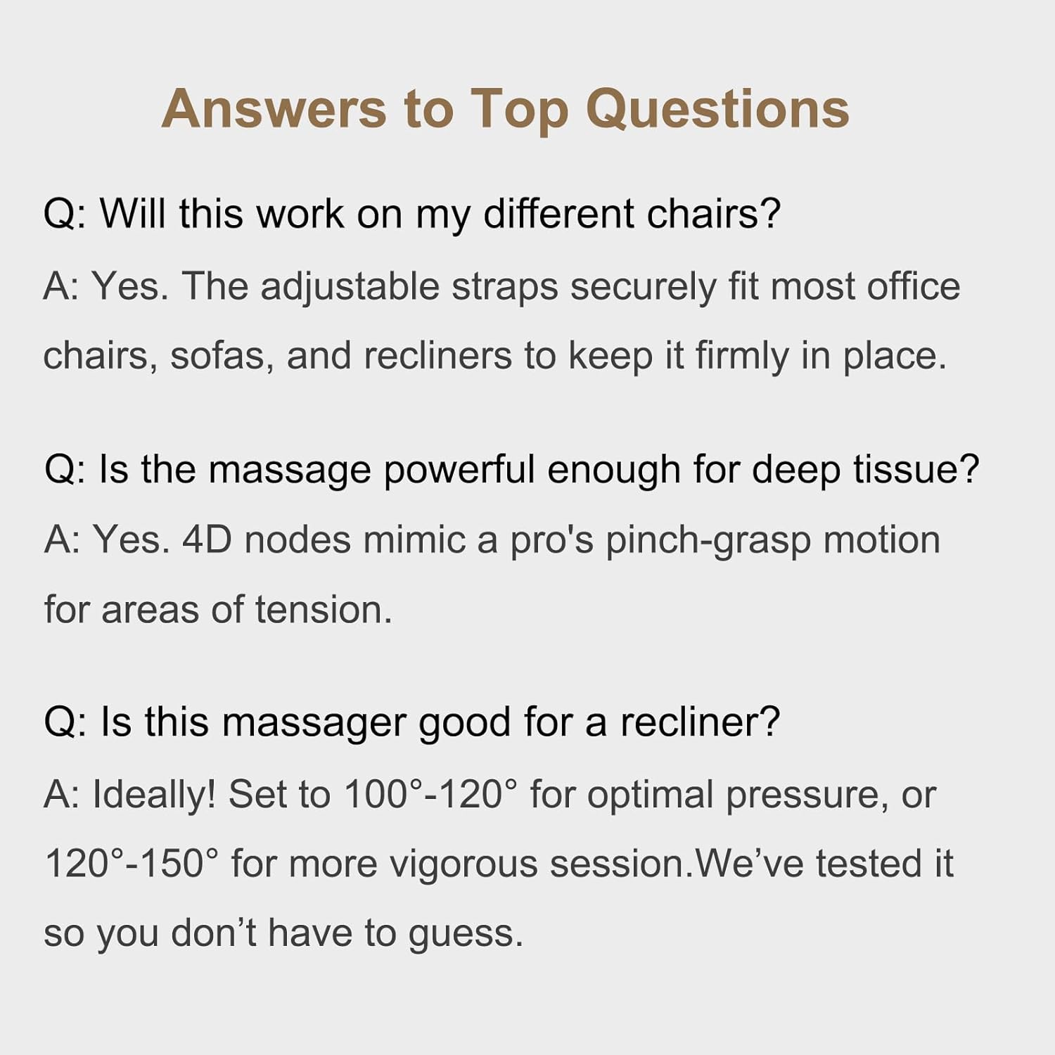 Customize your relaxation with 3 heat levels and 5 vibration modes. Whether you’re lounging on the sofa and recliner, or prepping for a workout, our smart settings adapt to your mood – quick heat reaches 107°F in minutes, while vibrations range from subtle to intense, giving you full control over your comfort.